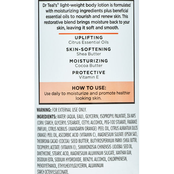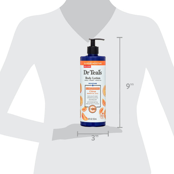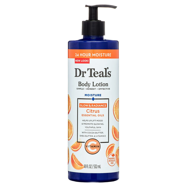 - Revitalize and moisturize your skin with Dr Teal's Body Lotion with Vitamin C & Citrus Essential Oils. Formulated with shea butter, cocoa butter and vitamin E, this restorative blend nourishes and renews for healthy-looking skin. Dr Teal's Vitamin C & Citrus Body Lotion brings moisture back to the skin, leaving it soft and smooth, while citrus essential oils soothe the senses. Dr Teal's products are infused with essential oils to relax, replenish and rejuvenate your mind and body. Take a moment for yourself tonight so you can feel your best tomorrow.
