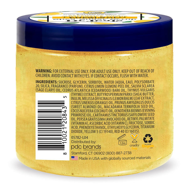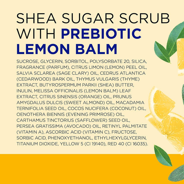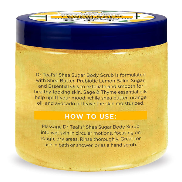 Dr Teal’s Shea Sugar Body Scrub with Prebiotic Lemon Balm and Essential Oils is formulated with Shea Butter and Sugar to exfoliate and smooth skin. Shea butter, orange oil, and avocado oil leave the skin moisturized with every use. Microbiome-friendly Prebiotic Lemon Balm helps support good bacteria to keep your skin in healthy balance, while a blend of Lemon, Sage, and Thyme essential oils helps relax the mind and uplift the mood. Paraben-free, phthalate-free, and never tested on animals, we craft our products to decrease your stress and promote all forms of wellness. Dr Teal's Shea Sugar Body Scrub with Prebiotic Lemon Balm is a great exfoliant for use in the bath or shower, or as a hand scrub to help soften and smooth skin. Pair with your favorite Dr. Teal's product to complete your bath experience.