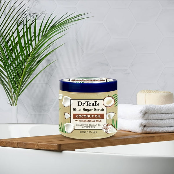 Dr Teal’s Shea Sugar Body Scrub is formulated with Shea Butter, Sugar, and Essential Oil to exfoliate and smooth skin. Essential oils help rejuvenate the mind, while shea butter, coconut oil and avocado oil leave the skin moisturized.