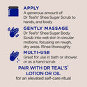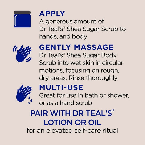- HOW TO USE: Massage Dr Teal's Shea Sugar Body Scrub into wet skin in circular motions, focusing on rough, dry areas. Rinse thoroughly. Also try as a hand scrub!