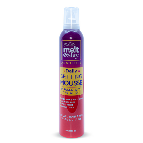 - Esha’s Melt N Slay Setting/Hair Mousse is infused with Castor Oil to provide healthy moisture and shine.