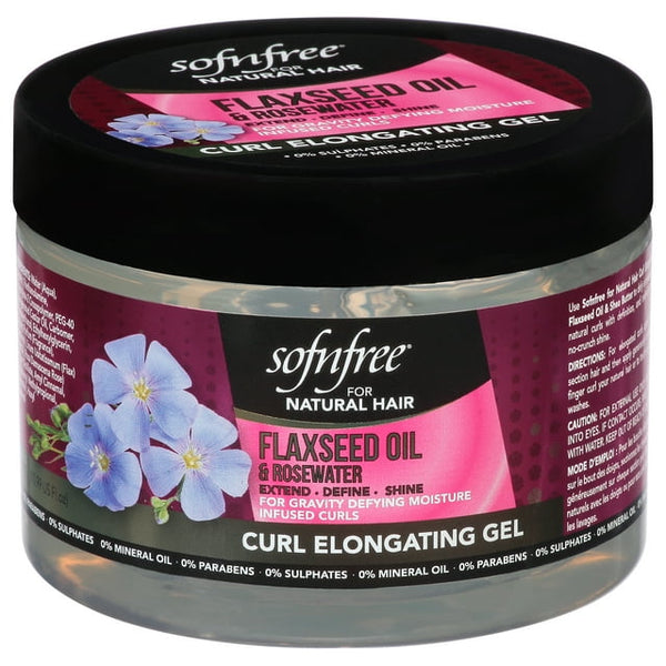 - ELONGATING HAIR GEL FOR NATURAL HAIR - Sofn'Free's Curl Elongating Gel with Flaxseed Oil and Rosewater defies shrinkage, stretches natural curls with definition, and maintains a no-crunch shine.