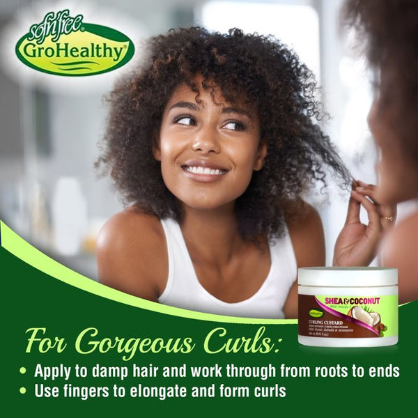• LONG-LASTING CURLS - Sofn’Free GroHealthy Shea & Coconut Curling Custard is the perfect natural hair curling cream for creating long-lasting, shiny spirals and gorgeous curls.