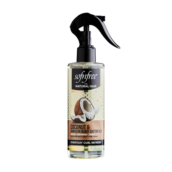 - Sofnfree for Natural Hair Everyday Curl Refresh with Coconut Jamaican Black Castor Oils gives hair a quick infusion of moisture to revive style and to prevent the tugging breakage associated with the styling of dry curly or coiled hair.