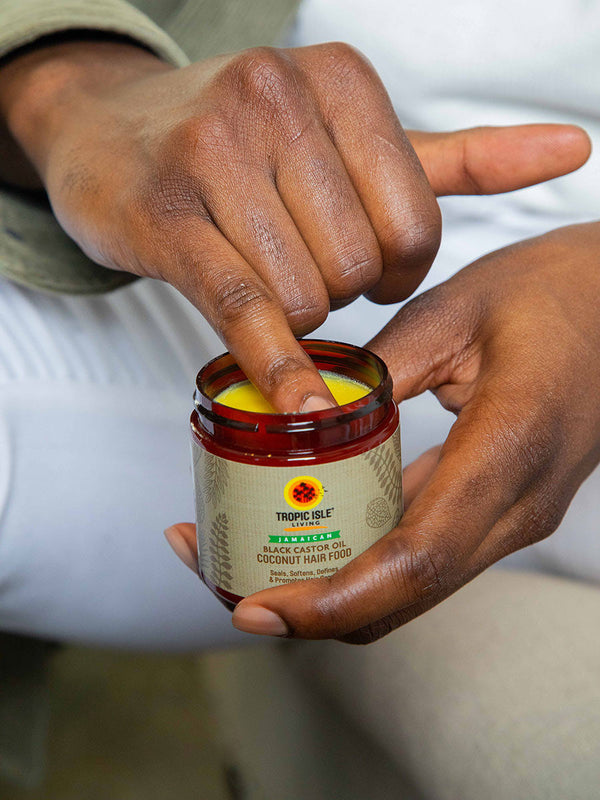 After conditioning with the Tropic Isle Living Jamaican Black Castor Oil Conditioner, section hair & apply the Tropic Isle Living Jamaican Black Castor Oil Coconut Hair Food.